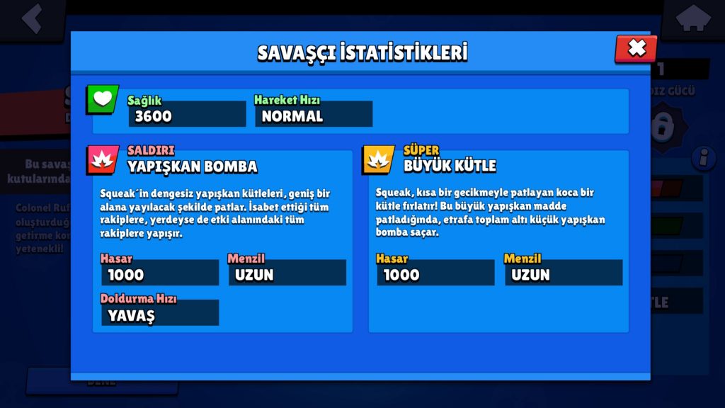 Brawl Stars Squeak ne zaman gelecek ve Squeak çıkarma taktiği var mı? Bu karakter çok kısa bir süre önce oyuna dahil oldu. Oyunda en sevilen karakterlerden biri haline gelen Squeak oynayışı eğlenceli olan bir karakterdir. Squeak, orta derecede sağlığa sahip ve hasarı da iyi denilebilecek olan bir Efsanevi karakterdir. Hem duvara hem de rakiplere yapışan ve patlayan bir yapışkan madde fırlatarak saldırı yapar. Özel vuruş, Büyük Kabarcık, her biri patlayan altı adet damla halinde patlayan dev bir yapışkan fırlatmaktadır.